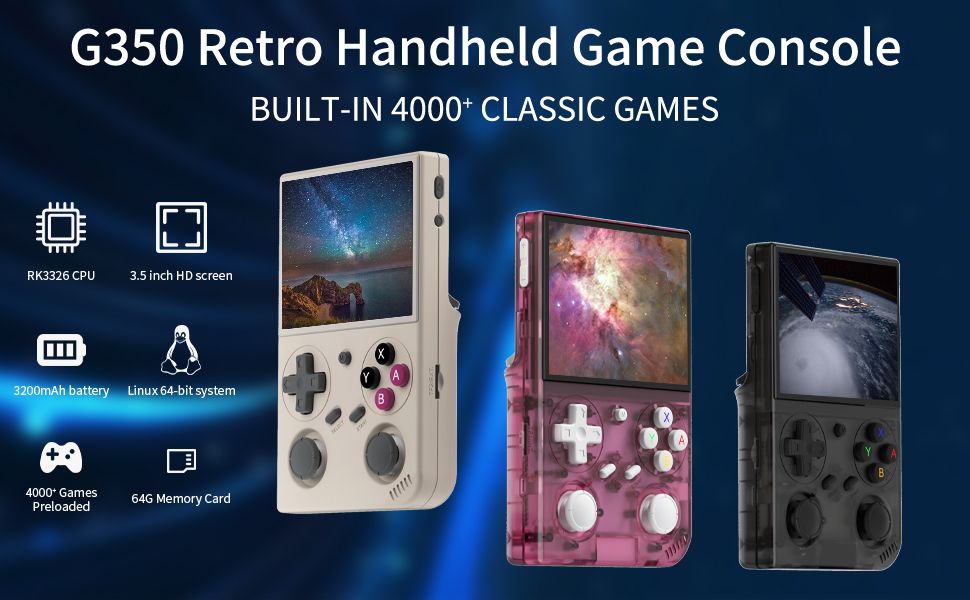 - 【4371 IN 1 Preloaded Game Console】 2024 upgrade G350 handheld game console , Built in 64G SD Card 4371 classic games, support more than 10 game format . Linux System can add emulators and games with related format.