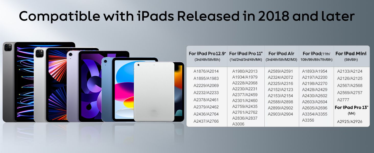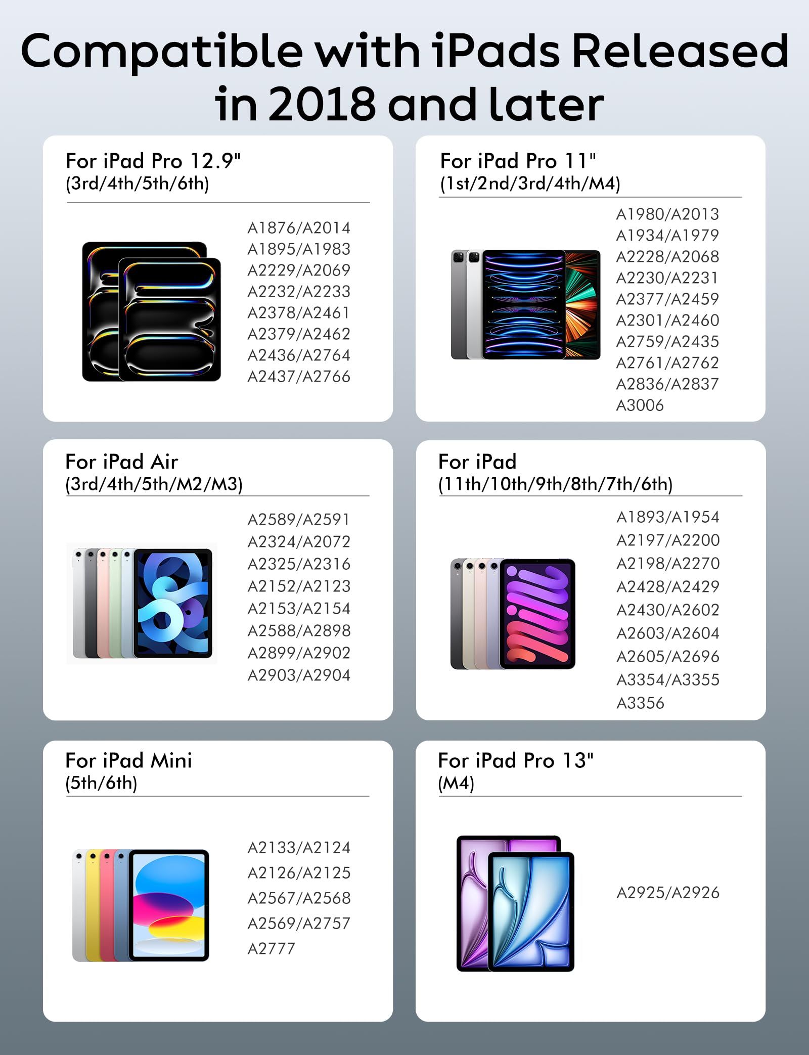 - 【Specialized for iPad 2018-2025】Only compatible with iPad 11th/10th/9th/8th/7th/6th Gen, iPad Pro 11"/12.9"/M4, iPad Mini 6th/5th Gen, iPad Air 3rd/4th/5th/M2/M3 Gen.(Please go to [Setting>General>About] to confirm your iPad's model name before placing order. Not Compatible with other ipad models or any other brand touchscreen devices)