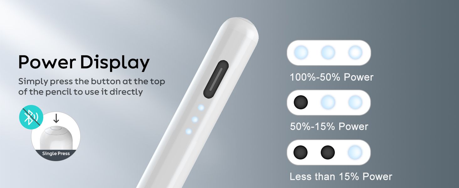 - 【Ideal Gift】 Three-light indicator displays battery level at a glance. Three lights on: 100%-50% power, two lights on: 50%-15% power, one light on: less than 15% power. With the exquisite packaging box, the stylus is a perfect Christmas gifts for artists, students, educators, business professionals, and everyday iPad users.