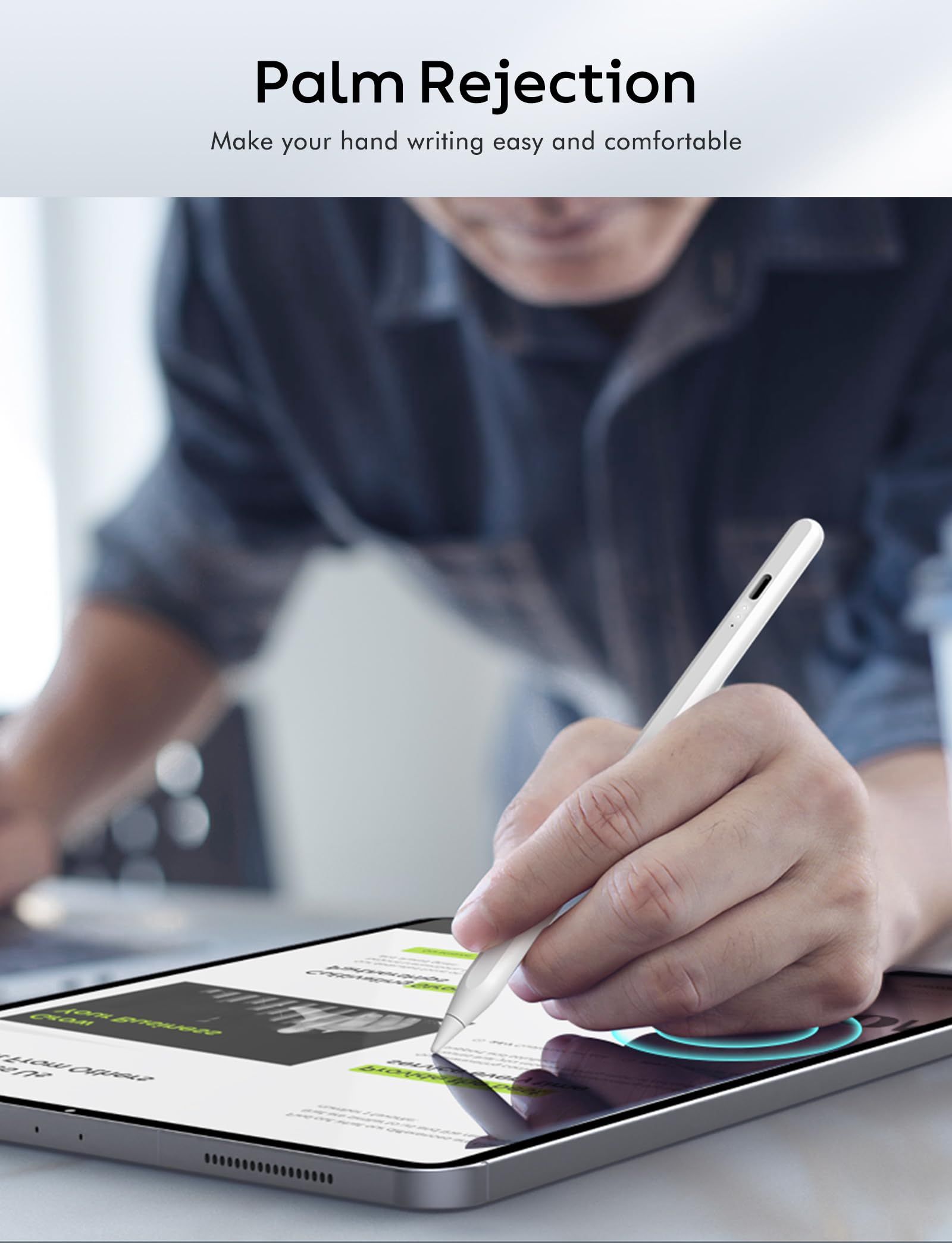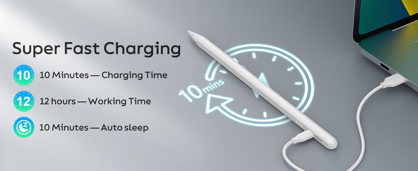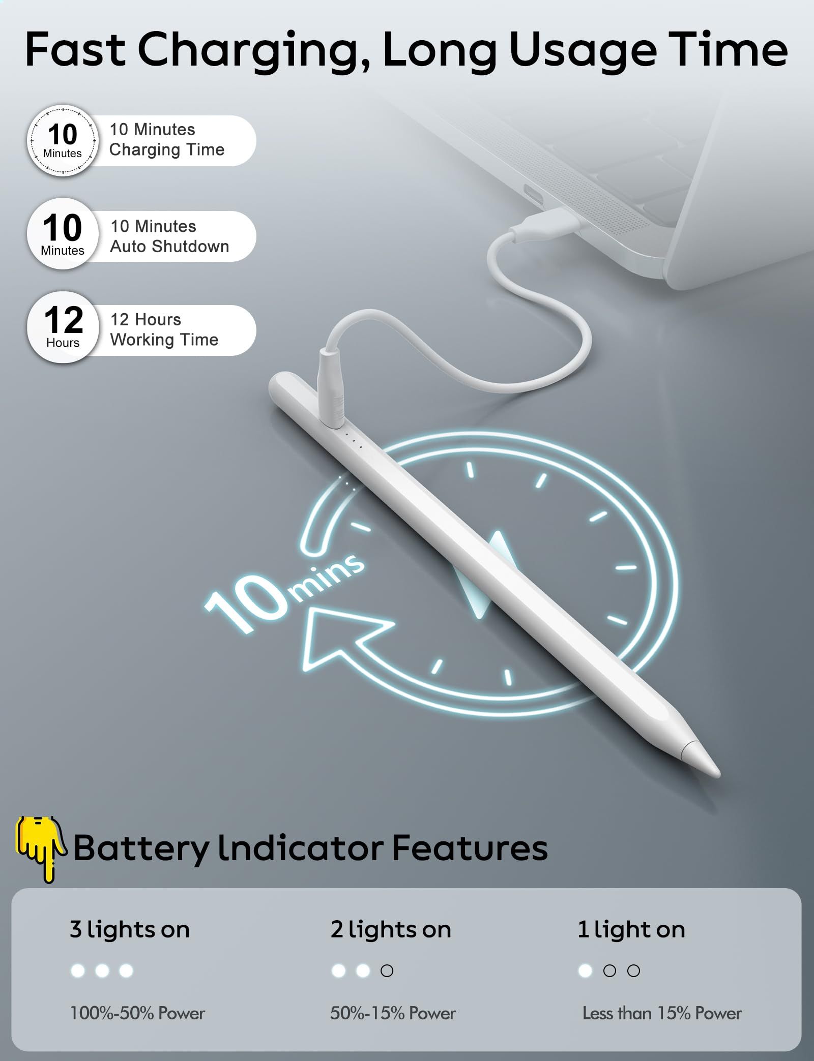 - 【10 Mins Fast Charging & Long Usage Time】 The iPad pencil charges fully in just 10 minutes and allows 12 hours of continuous use with no need for a fast-charging adapter. When the stylus is inactive, it will automatically shut down after 10 minutes of inactivity, flashing during the final minute of sleep mode and reactivating upon pickup.